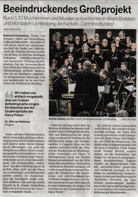 Unter der Gesamtleitung von Musik- und Chordirektor Dr. Dirk van Betteray zeigten 130 Sängerinnen und Sänger aus sieben Chören der Region, fünf Schlagzeuger, drei Solisten und zwei Pianisten, insgesamt also 140 Interpreten, was sie über Wochen als Projekt einstudiert hatten und dass es auch im Bergischen gute und talentierte Interpreten gibt, die das Publikum zu begeistern wissen. „Viele Sangesenthusiasten sind schon lange dabei“, freute sich van Betteray, der bereits 2012 Carmina Burana bei der Eröffnung der Morsbacher Kulturstätte inszeniert hatte.